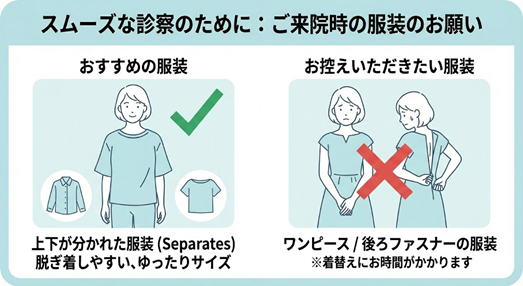 当院には専用の更衣室がございません。 診察室内での準備を円滑に行うため、ワンピース・オールインワン・つなぎ等の上下繋がった服装の着用は極力控えていただき、脱ぎ着のしやすい上下分かれた服装でお越しくださいますようお願い申し上げます。